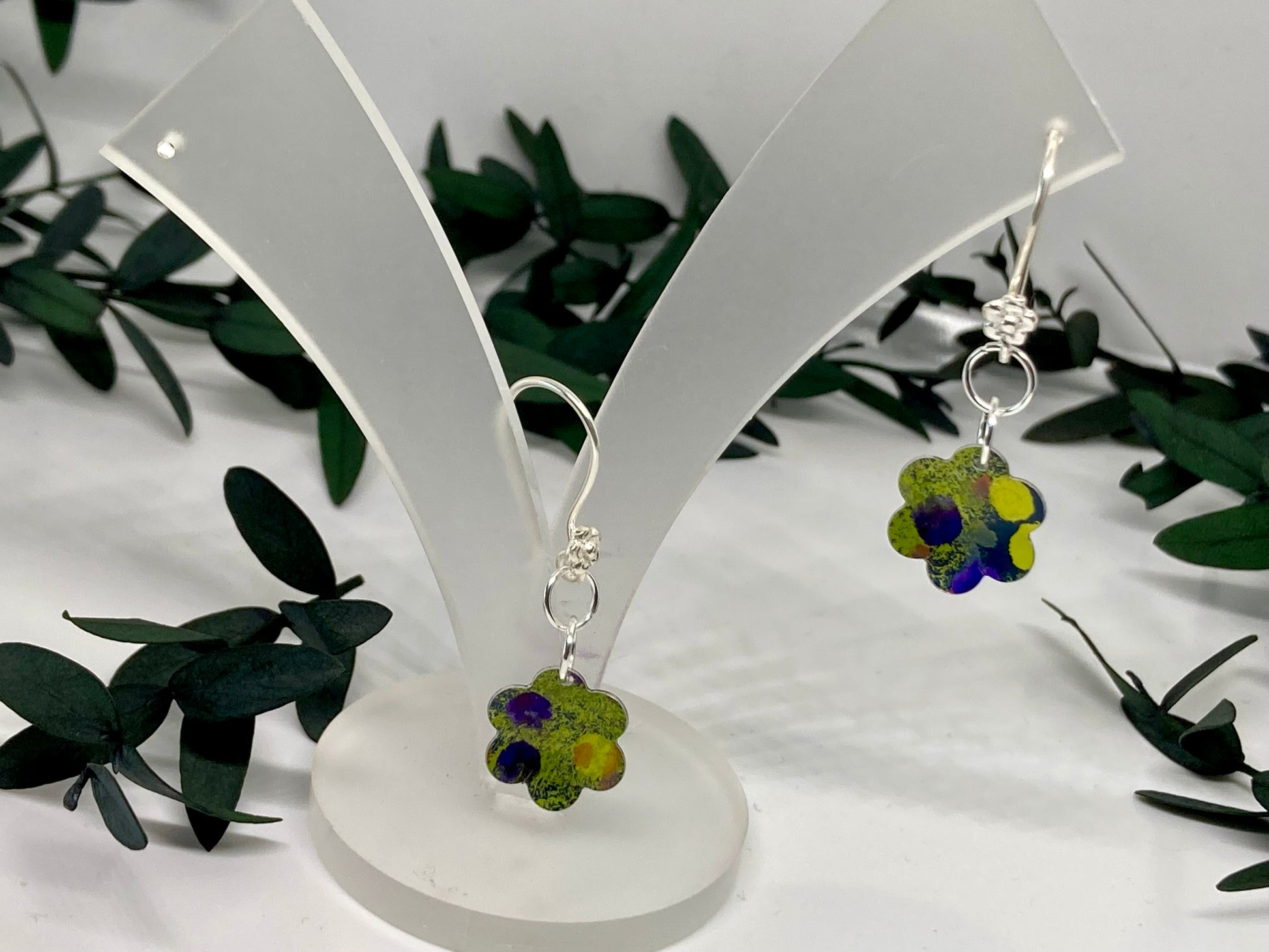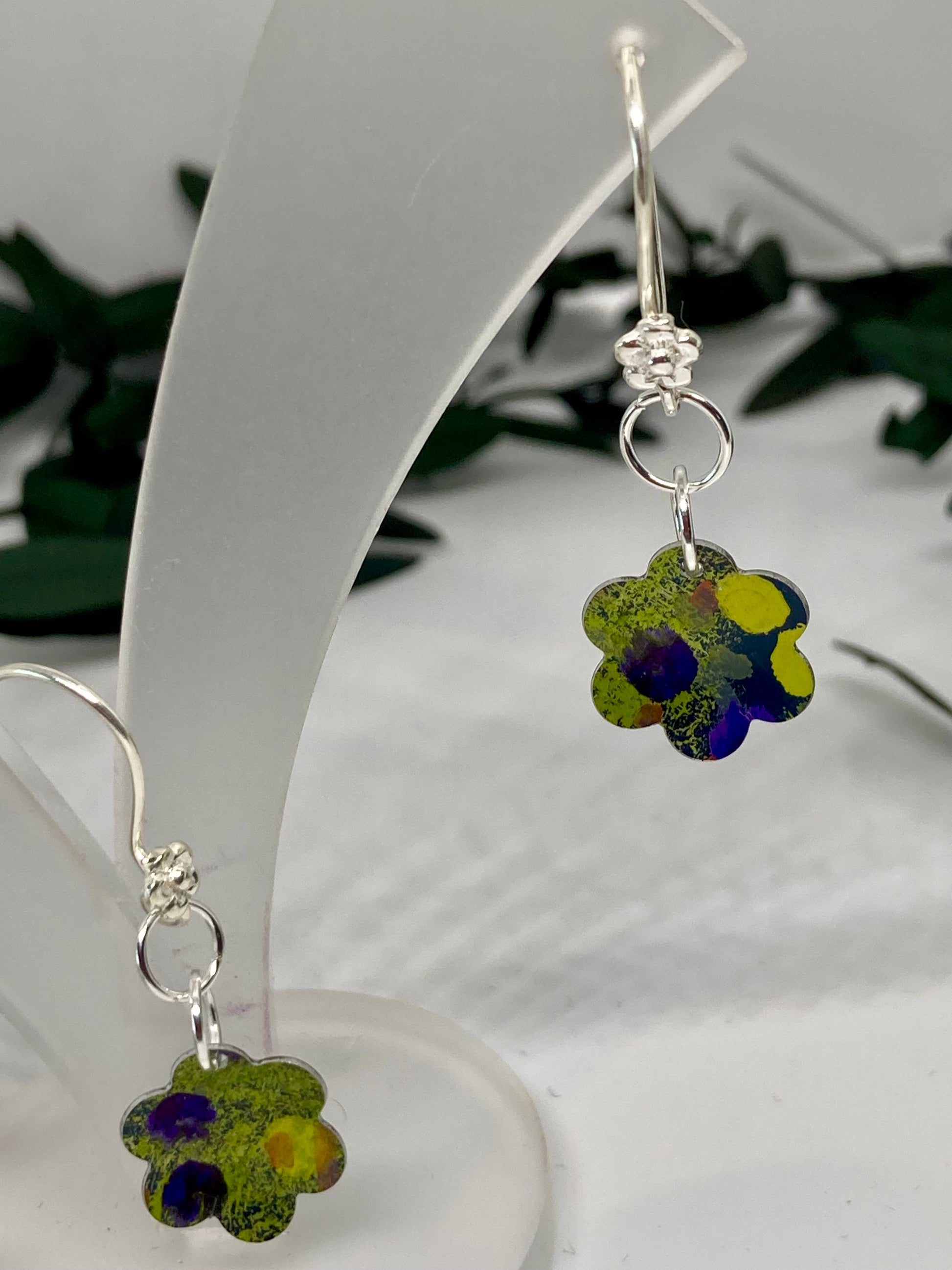 These charming hand-painted aluminium earrings feature a petite flower-shaped drop, bringing a touch of playful whimsy to modern jewellery design. The floral charm is decorated in a vivid abstract pattern with a palette of bold lime green, deep violet, bright yellow, cobalt blue, and hints of orange.