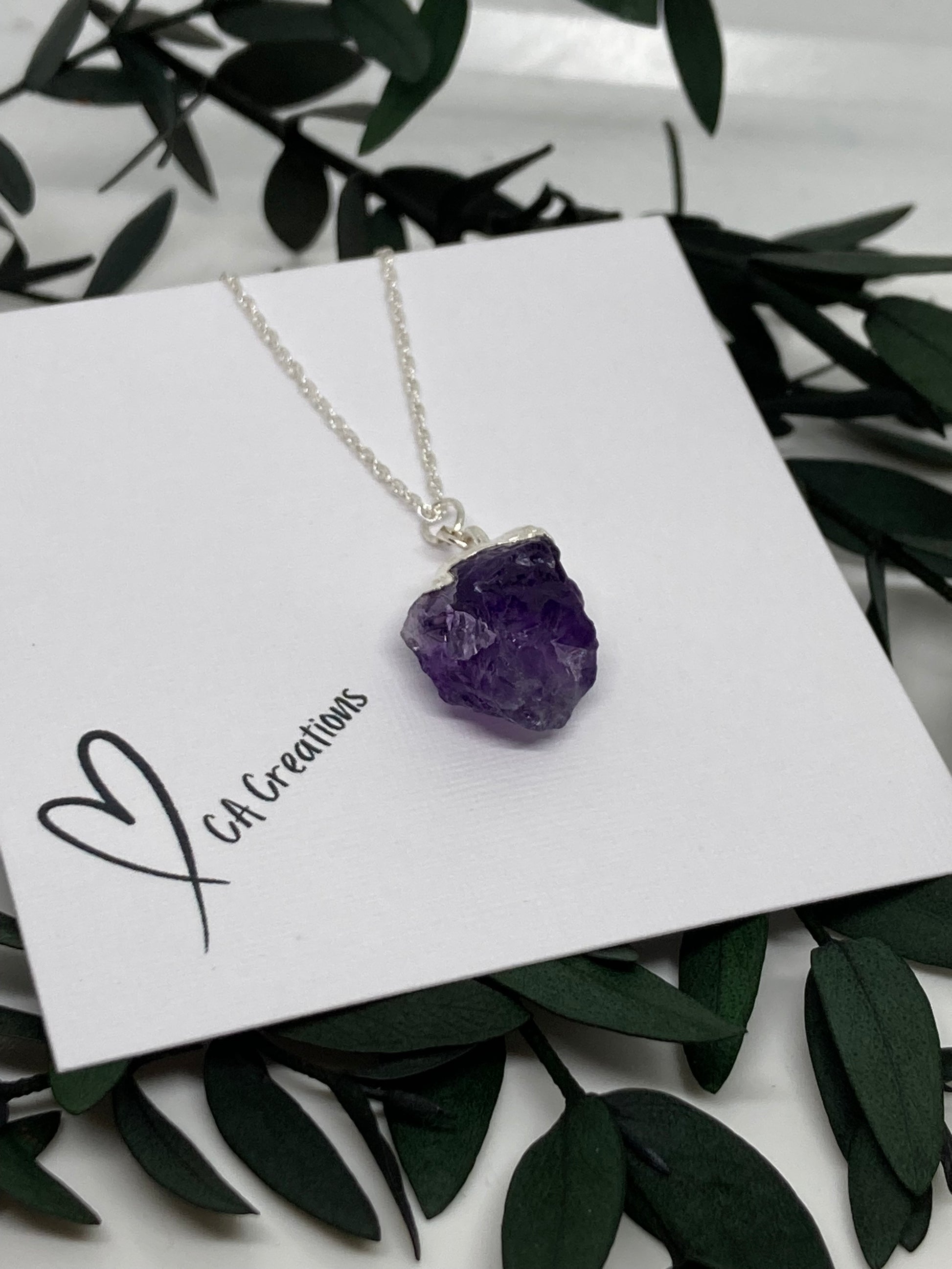 Embrace the natural beauty of raw gemstones with this striking Amethyst Crystal Necklace. Each pendant features an unpolished, organically shaped amethyst stone showcasing rich violet tones and unique natural textures. The crystal is securely capped in a silver setting, creating a beautiful contrast between the raw, earthy stone and the sleek metal finish.