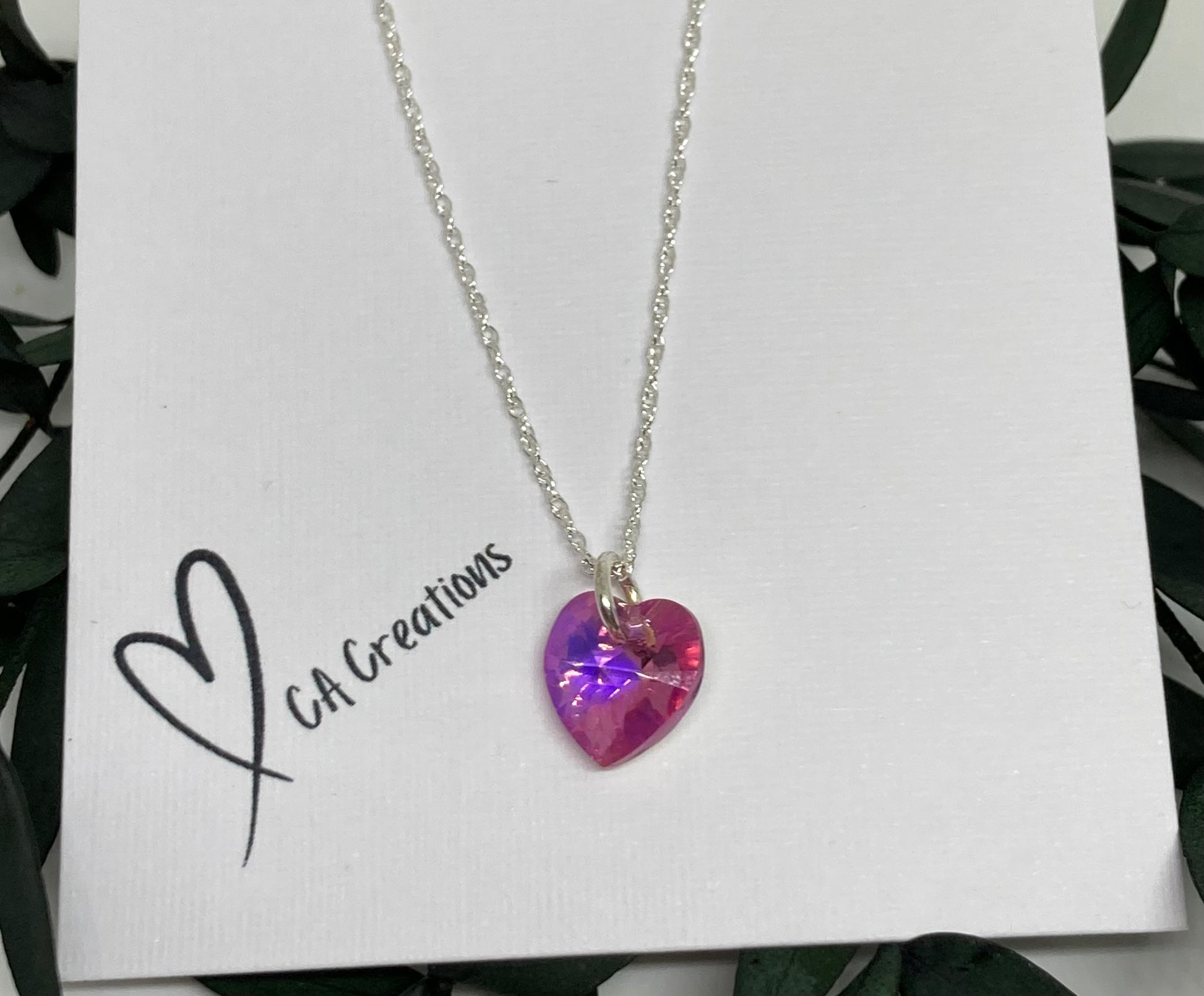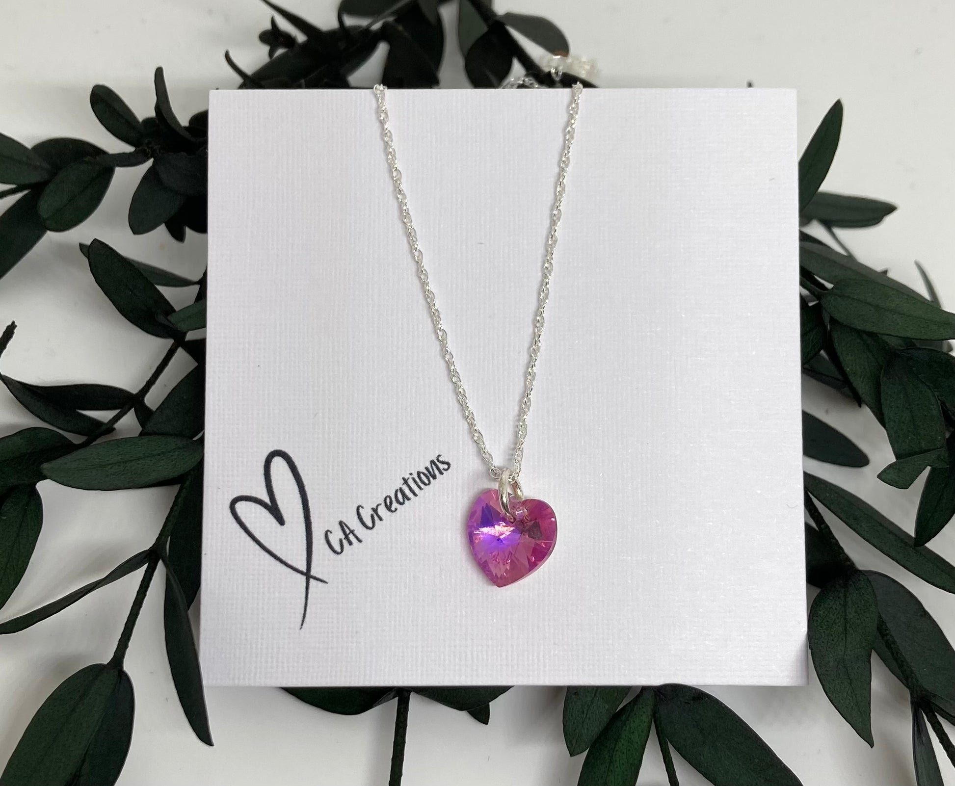 Classically beautiful Swarovski 10mm crystal heart hanging from a 16” sterling silver rope chain. The heart is coated on the back to maximise the pink colours when the light hits the facets.