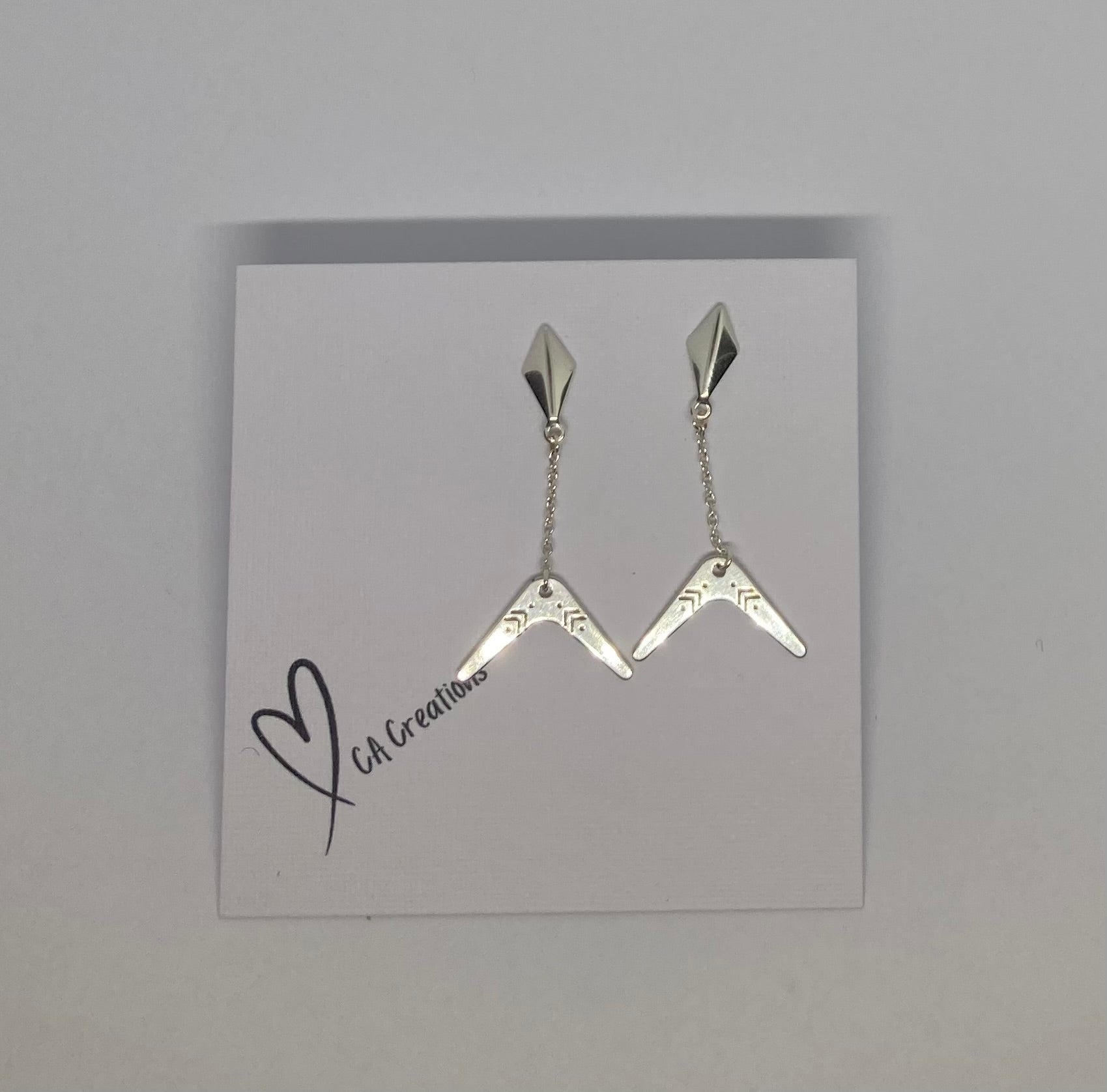 Sterling silver fun boomerangs dangling on silver chain. These are attached to some silver ear studs. Certainly something a little bit different.