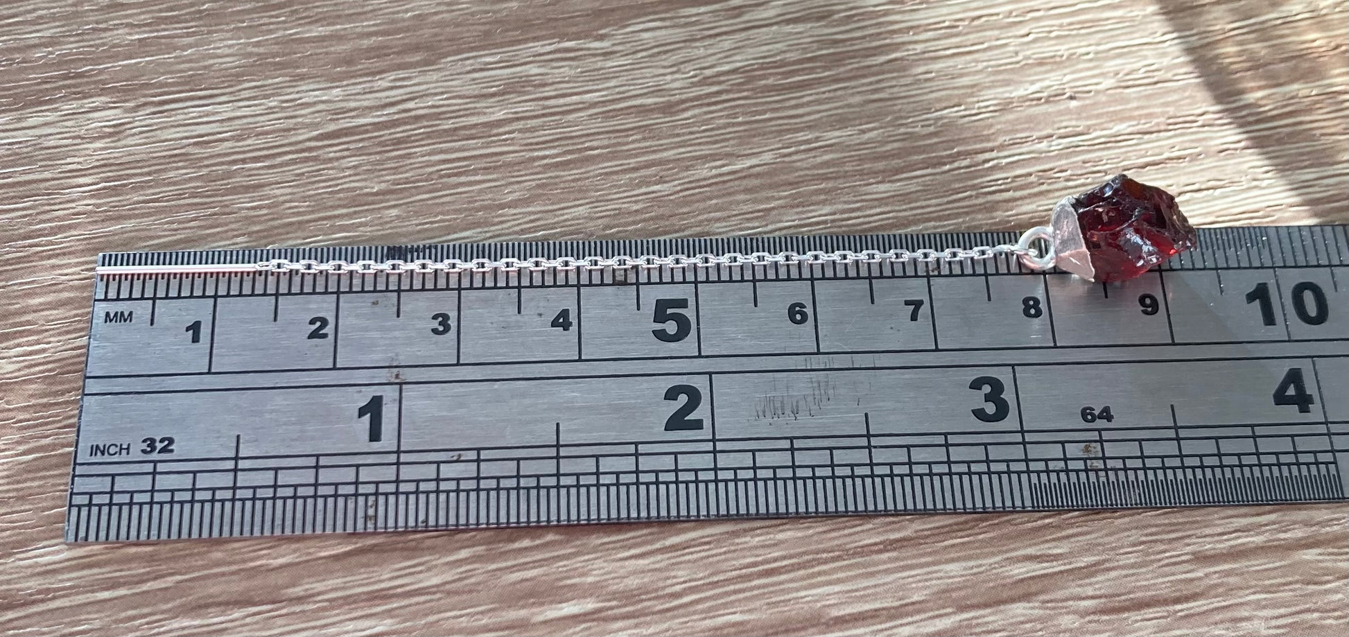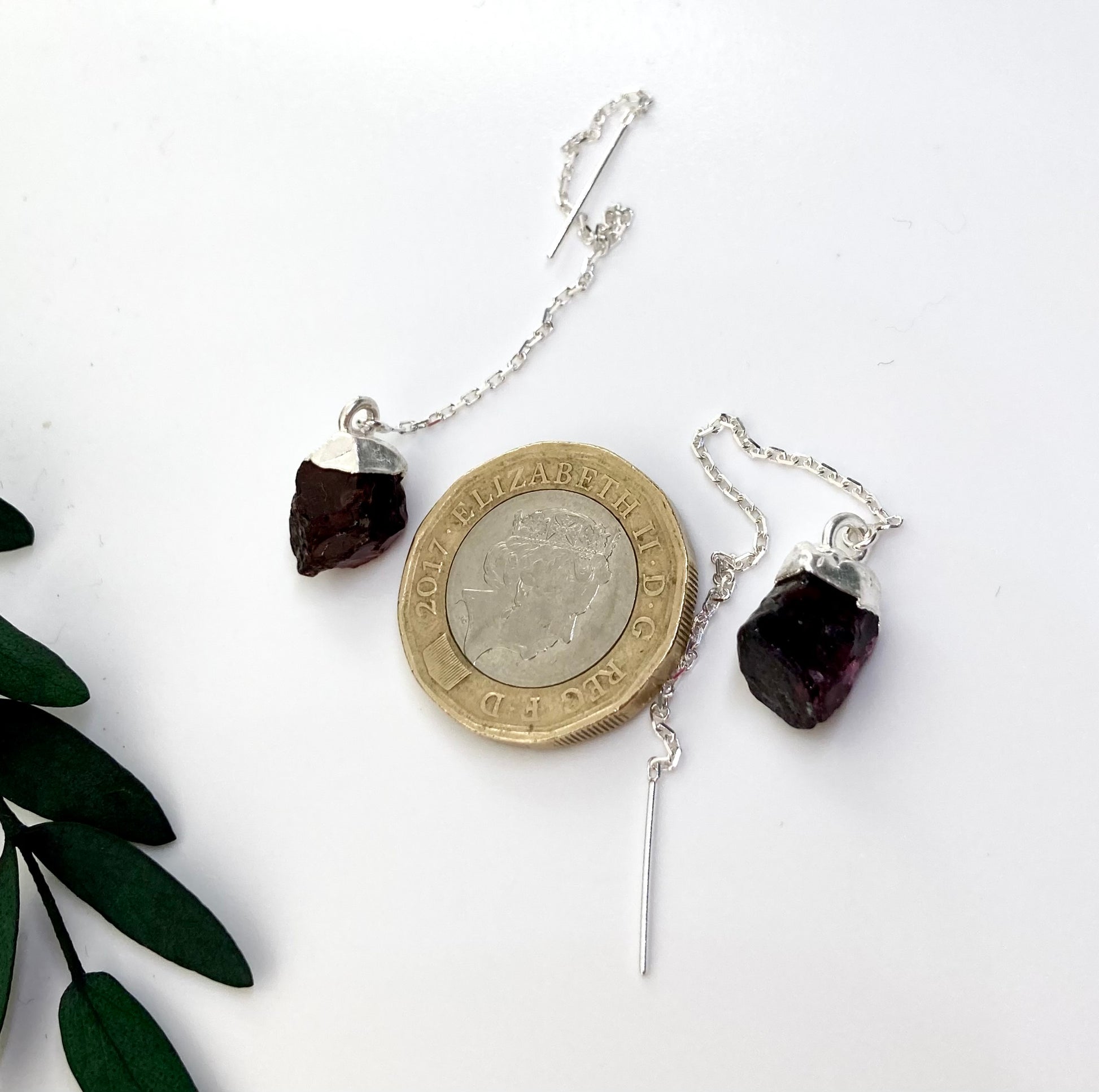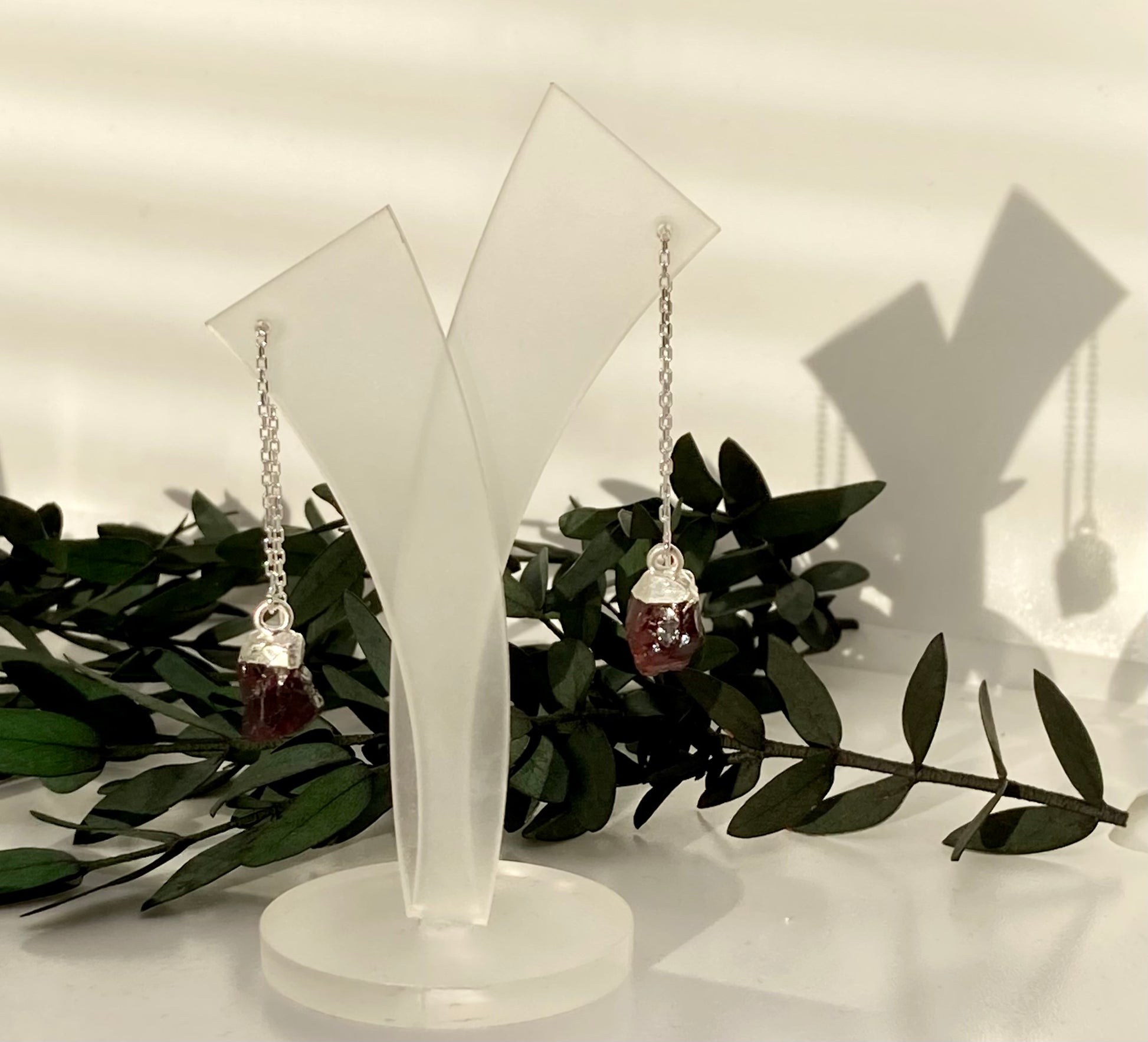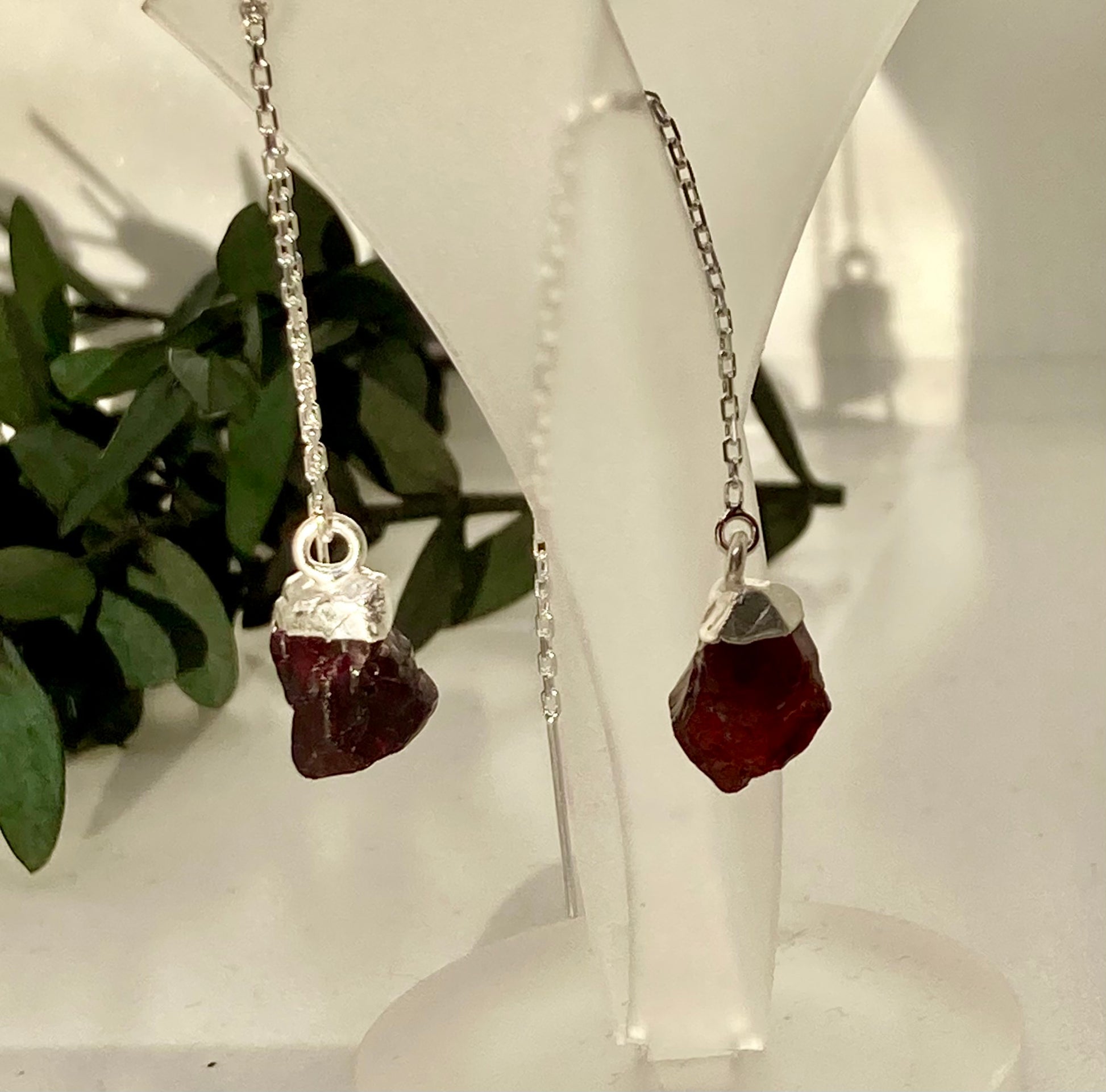 These striking earrings feature natural, raw garnet stones suspended from delicate silver threader chain drops. Each garnet nugget is left beautifully uncut to showcase its organic texture and deep wine-red tones, making every pair completely unique.