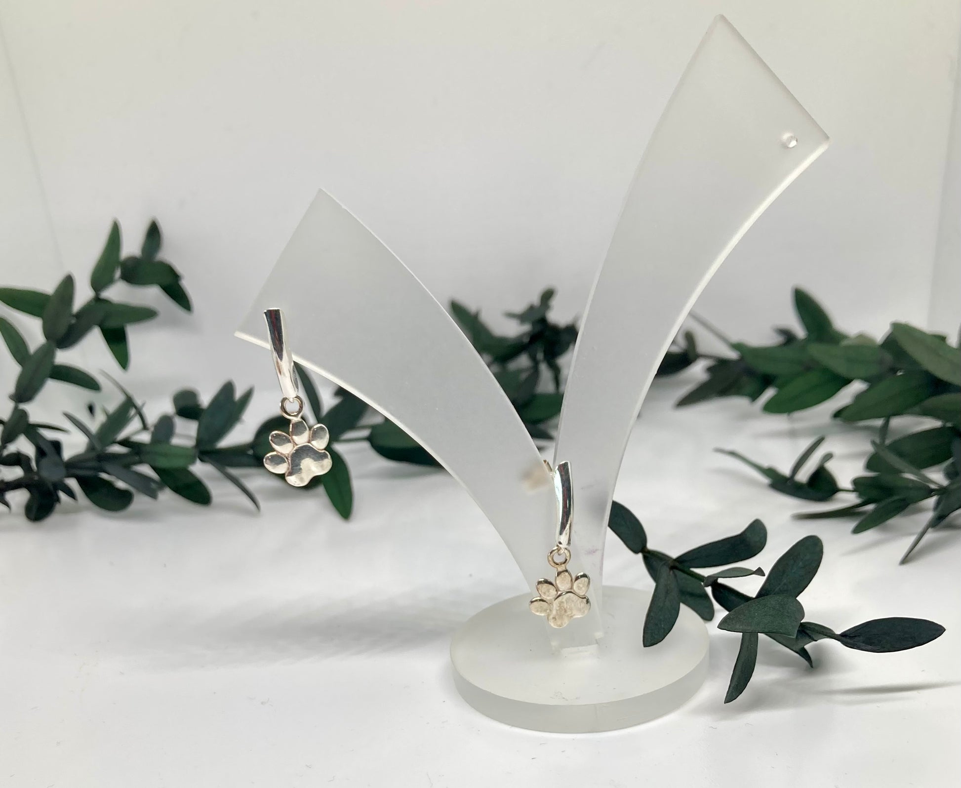 Fabulous pair of sterling silver stud earrings with a dog paw charm hanging from a silver bar.